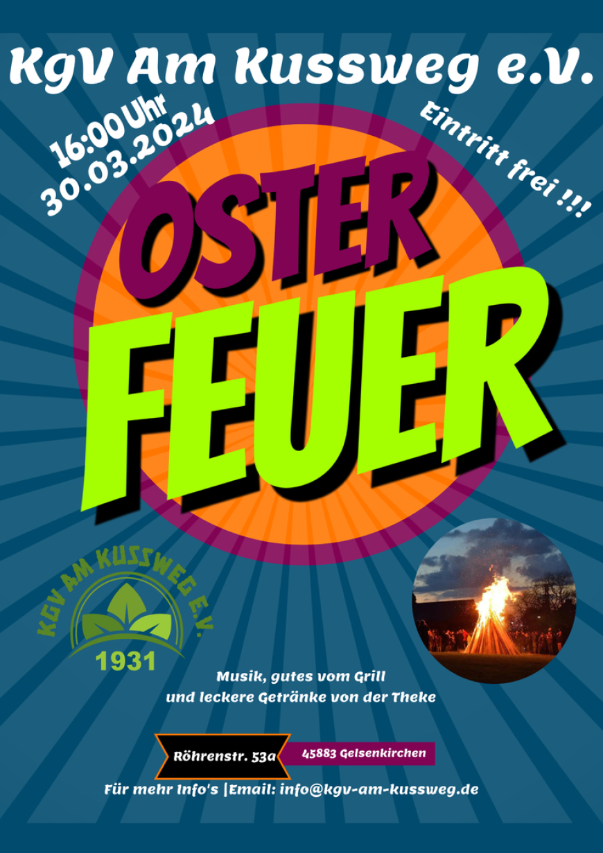 Am 30.3.2023 veranstaltet der KGV KUSSWEG in diesem Jahr wieder ein Osterfeuer. Ab 16 Uhr geht es los. Der Eingang ist in der Röhrenstr. 53a.