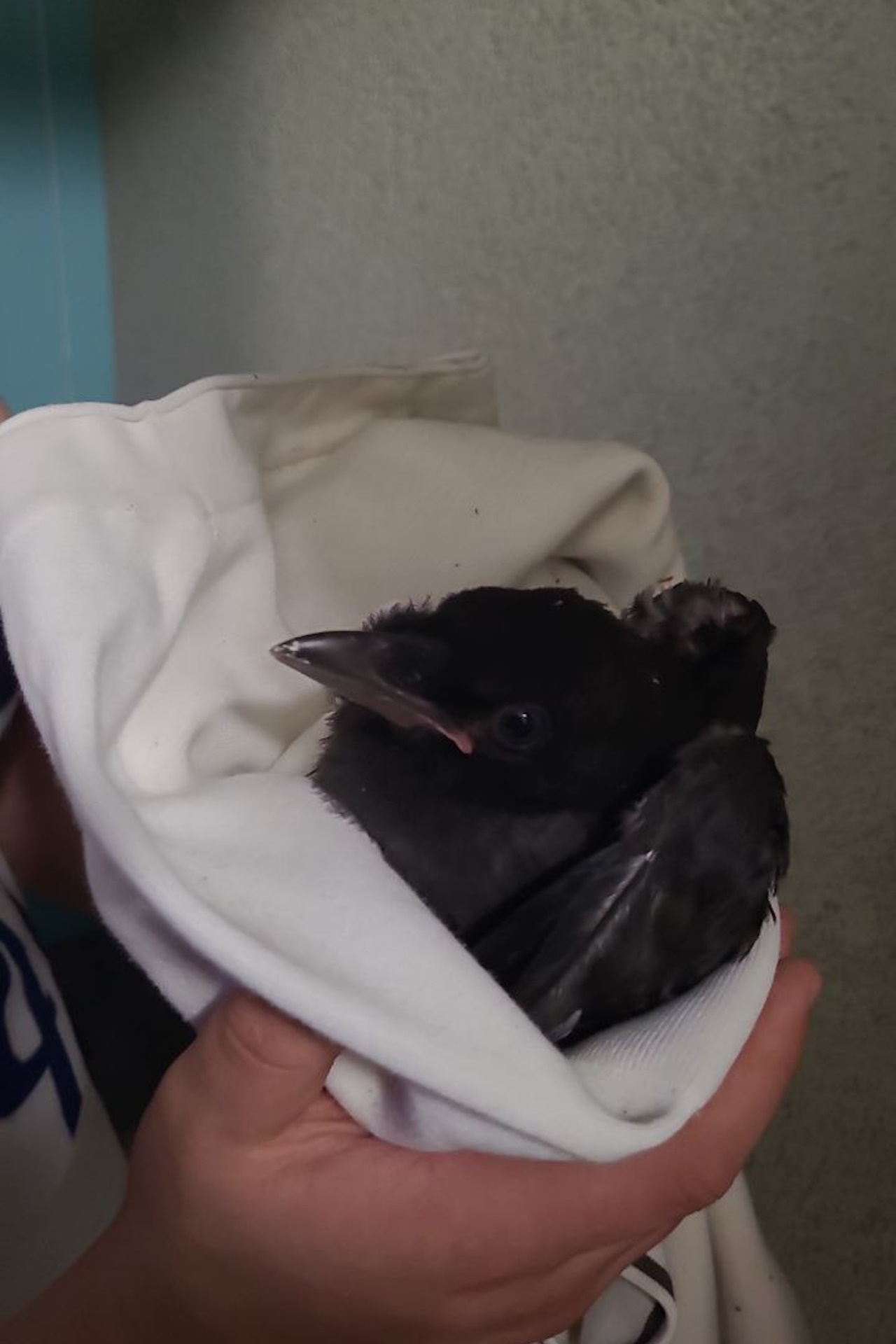 Heute gab es einen Anruf, weil ein syrischer Jugendliche einen flugunfähigen Rabe am Schillerplatz gefunden wurde. Das Tier war auf dem Nest gefallen. Der Jugendliche brachte es zu der Frau, die bereits im letzten Jahr an der Rettung einer Taube und eines Babyigels beteiligt war.